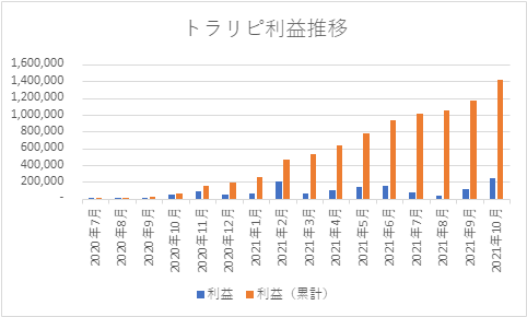 2020年7月、マネースクエアに口座開設して30万円を入金してスタートしました。約1年間でトラリピ利益累計は100万円を超え、利益率は年利16%程です(所得税を差し引く前の利益です)。
